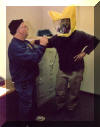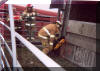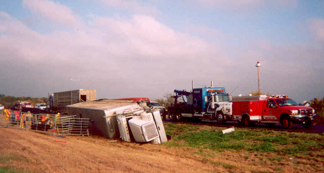 Overturned cattle truck causes quite a stink! The call for an unknown accident with an overturned semi came in at 3:30 am. First arriving units found a loaded cattle truck turned over on it's side. The driver of the rig was appeared to be uninjured and refused medical service. Fire units worked for 8 hours cutting on the trailer to free 36 Angus steers from the trailer so it could be up righted. There were five dead steers and one with a broken leg. First cow out had to check to see if the fence was secure, as Travis Theurer goes over the fence on top of FF Rick Brown. So much for the cowboys! Another cow which was blocking the exit had a broken leg and had to be drug out of the doorway so the rest of the animals could get out. (October 2004) M.E.S. Open House This years open house was quite a success and visitors had the opportunity to experience some different things. This year we put on an extrication demonstration showing the use of different tools. During the demonstration we received three alarms in about 15 minutes leaving the station with only two firemen. The visitors were impressed the quick response time of putting the rescue truck back together to make a car wreck and getting to watch the other fire units leave the station.