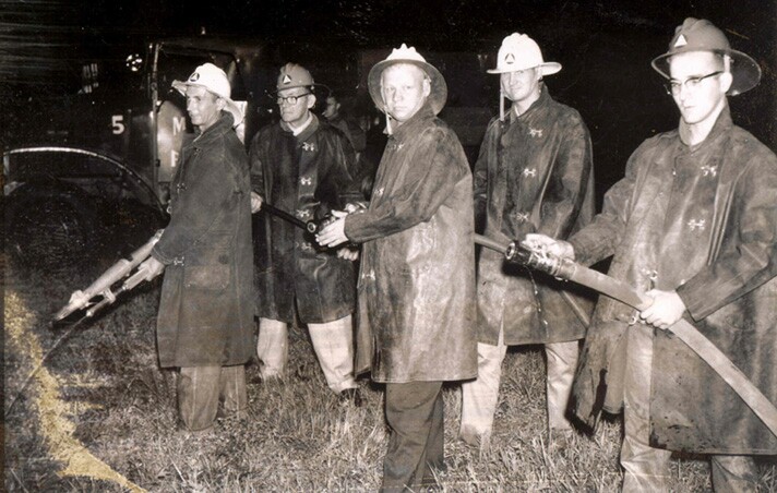 Firefighter Tommy Stoll jumps a fence at this structure fire in October 26, 1977.